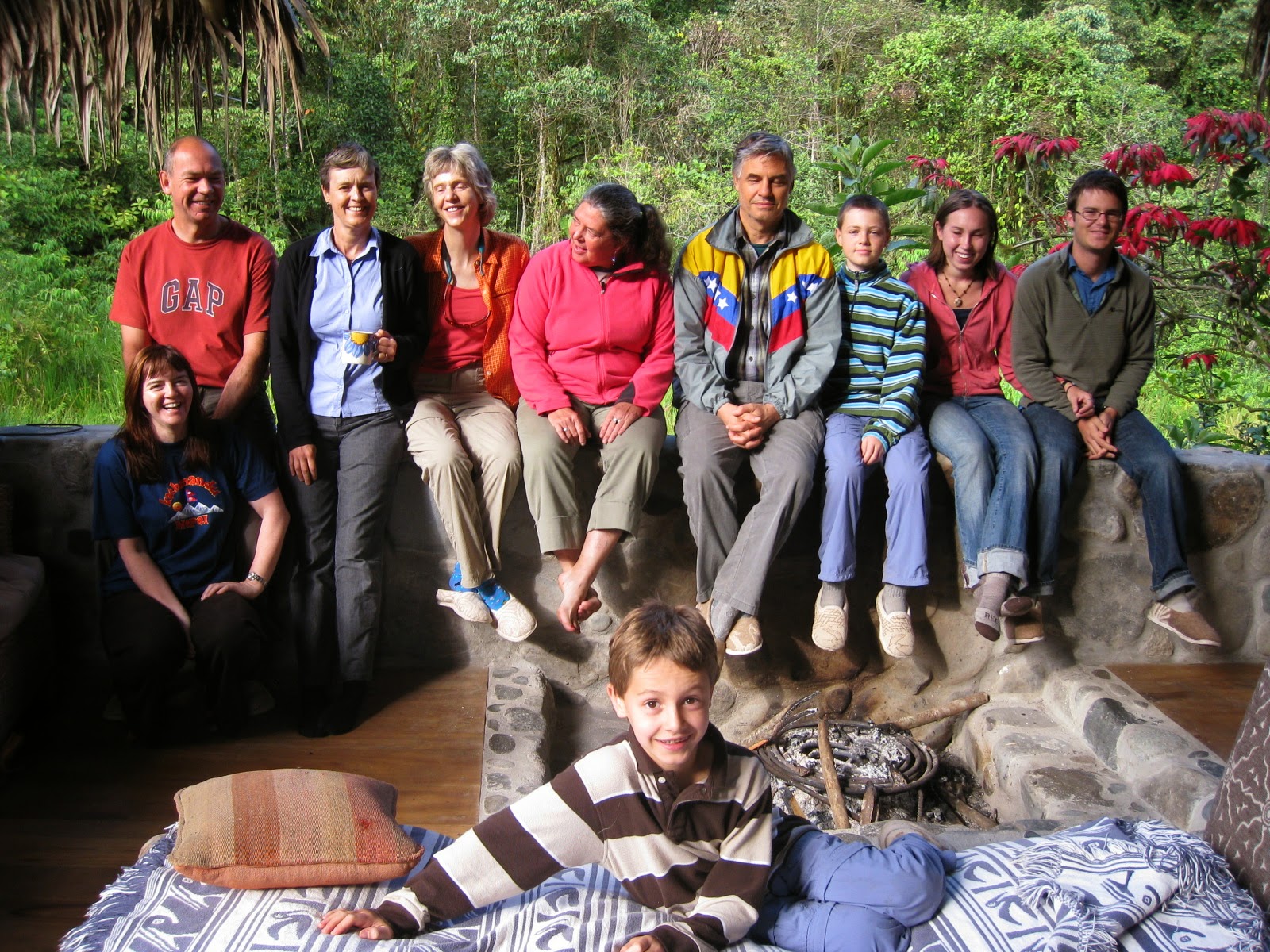 I’m second from left. Malcolm is in the front. To my right are his mother Laurie, my friend Melanie, Malcolm’s father TM, and Malcolm’s brother Thomas. We’re at El Monte, an ecolodge in Mindo: http://www.ecuadorcloudforest.com/